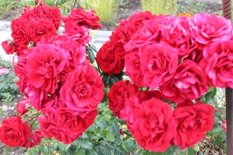 Роза Amadeus (Амадеус). Очень устойчивая к заболеваниям плетистая роза, привлекает внимание благодаря свои крупным, сияюще-красным махровым цветкам. Цветки появляются в кистях по 5-7 шт. Куст ветвистый, прямостоячий, густооблиственный, до 3 м высотой.