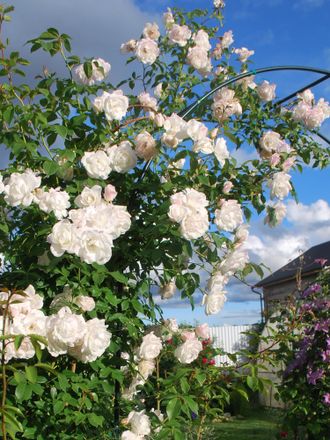 При благоприятных условиях плетистая форма Iceberg может разрастись до 3 метров и в ширину. При соблюдении агротехники выращивания и хорошем зимнем укрытии плетистая роза Айсберг Клаймбинг образует сильнорослый куст, который во взрослом возрасте приобретает закругленную форму кроны. К достоинству этого сорта относят незначительное количество шипов. Листья у него гладкие и блестящие, светло-зеленого цвета. Растение довольно зимостойкое, но даже если прошлогодние побеги вымерзли и не сохранились, то роза все равно расцветет – на побегах текущего года. Разрастается плетистая Айсберг-роза довольно быстро, что позволяет декорировать ею различные строения и ограждения. Несмотря на массу достоинств, у этого сорта розы, по мнению специалистов и садоводов, есть один существенный недостаток – очень слабый, практически незаметный запах.