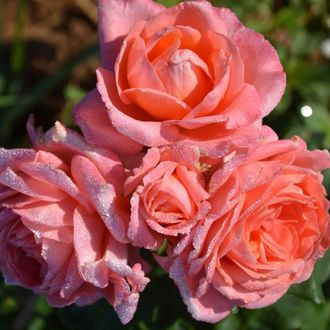 Цветки диаметром 8-9 см, элегантные, густомахровые, контрастные: внутренние лепестки оранжевые, внешние розовые. Аромат приятный, нежный. Цветение повторное, до заморозков. Куст высотой 80-100 см, шириной 60 см. Листва тёмная, устойчивая к заболеваниям. Рекомендуется для групповых посадок и срезки.