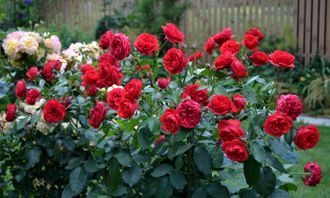 Розы флорибунда Аут оф Розенхайм (Out of Rosenheim) вырастают от 60 до 80 см в высоту и до 40 см в ширину. Цвет красный. Размер цветов от 8 до 9 см.