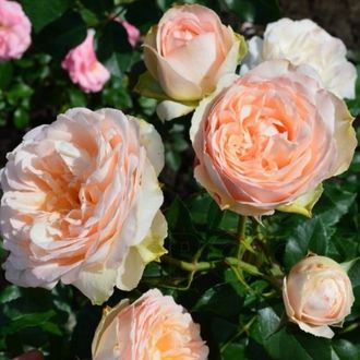 Цветки диаметром 8 см, махровые , кремово-розовые с абрикосовым центром. Аромат умеренный. Цветение продолжительное, повторное. Листва крупная, полуглянцевая, густая, очень устойчивая к заболеваниям. Куст компактный.