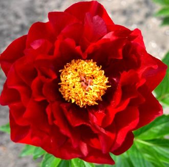 Ошеломительно яркие цветки с тремя рядами плотных гофрированных, атласных лепестков из кроваво-красного шелка. В основании цветочной чаши - контрастные золотые тычинки, собранные в пушистое колечко. Королевское цветение длится две недели!!! Отличается быстрым, мощным ростом и пышным цветением. Необычайно крепкие стебли!